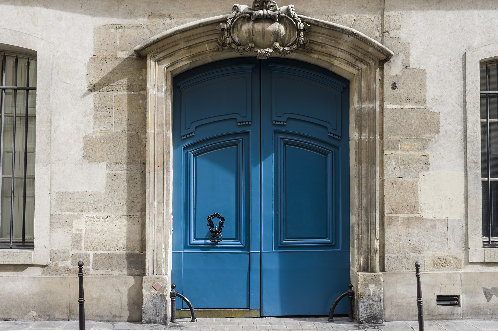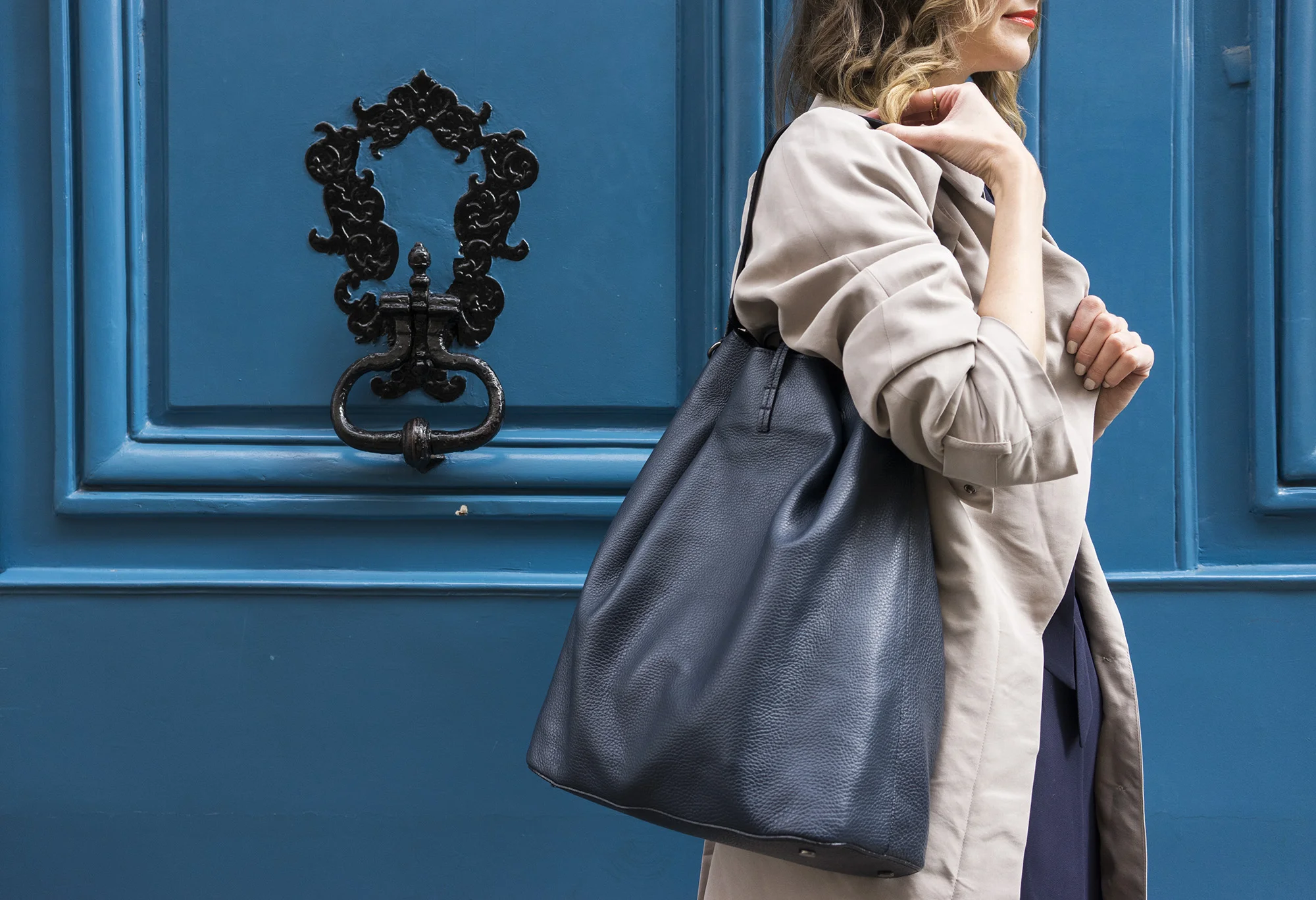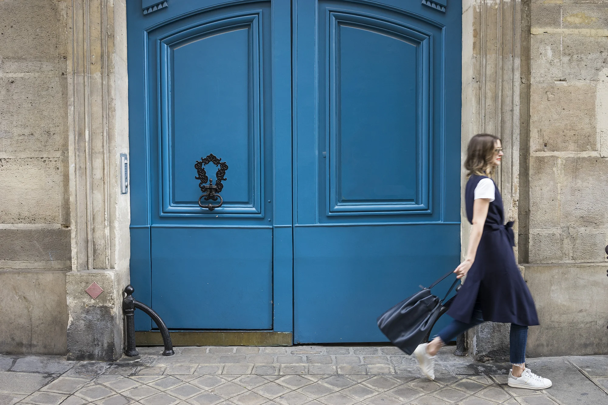So my intention with shooting a spring(ier) style post (i.e. sans big warm dressing gown coat from COS, which I’ve been living in during those said cold six months), was to help kickstart warmer weather (even if it’s just in my mind). I photographed it on a much sunnier, yet not much warmer day (fittingly), outside a blue door that I spotted on a recent bike ride through le Marais - thinking it'd make a nice backdrop to my almost all blue attire. Despite being the colour of cold, I’m a big advocate for blue, or rather navy. It’s not as somber as black, but just as easy to wear - throw on and mix up with neutral shades and pretty much any colour and pattern. And it can be worn right through to summer – it’s an all season, all weather colour. Just top with a beige trench and slap on a lighter lip colour and you’re dressed for spring(ish), just don’t forget your umbrella!