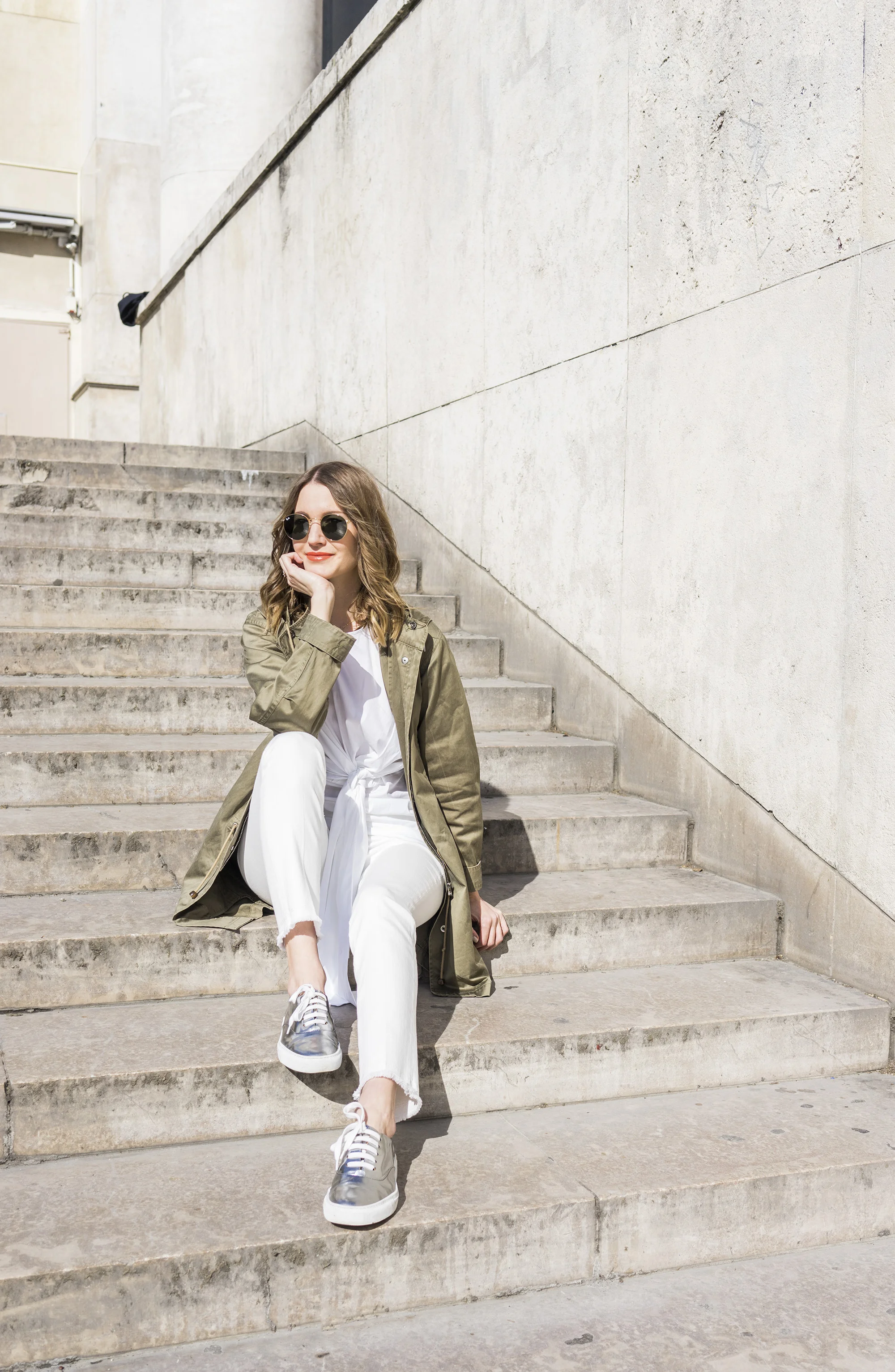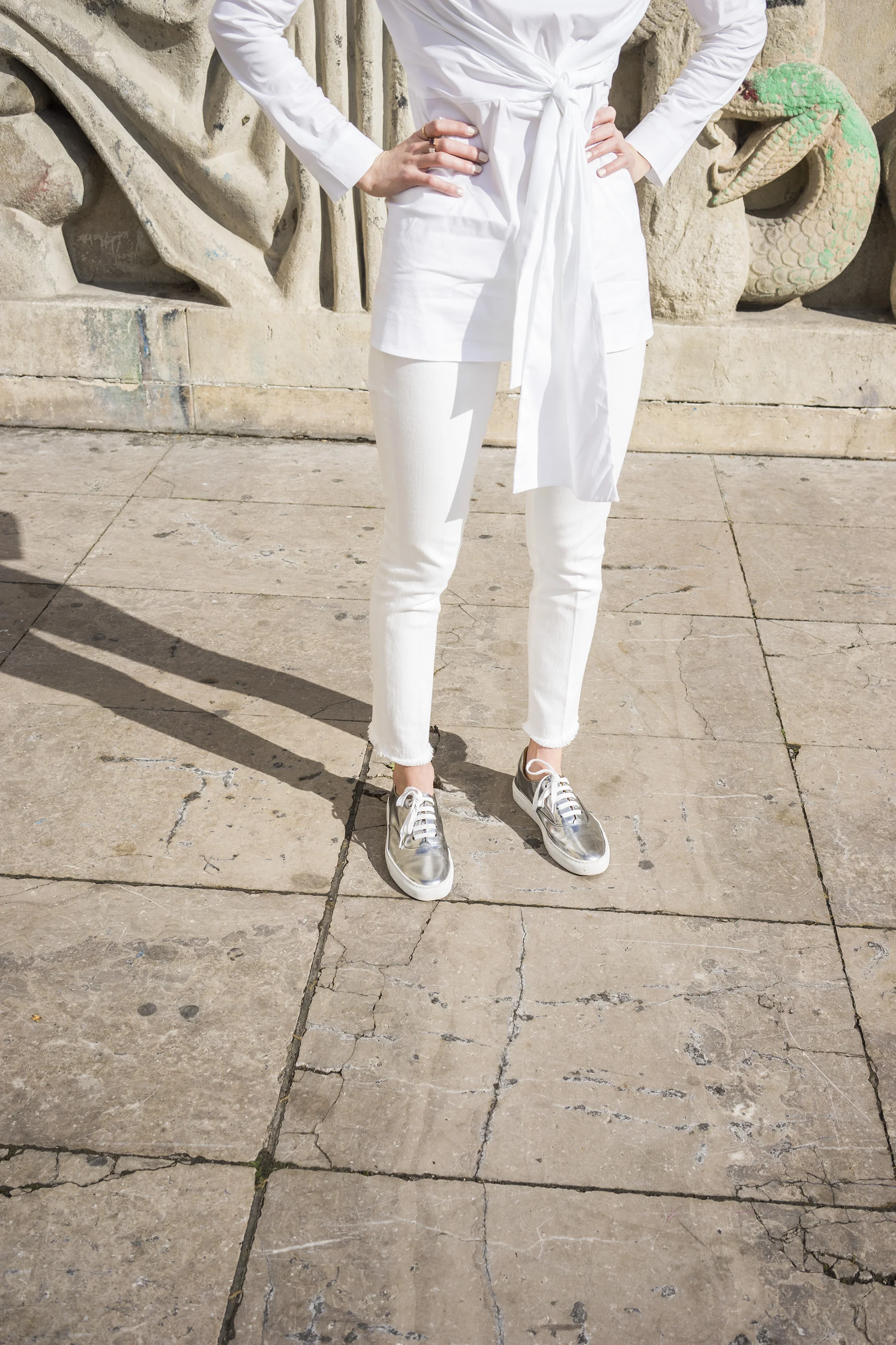 ME+EM white jeans (they run a little big so take a size down // & Other Stories Silver Shoes // Ray Bans // COS bow front shirt shirt - similar Topshop one here, Ellery one here and Tibi here // Tom Ford // Noir Jewellery earrings from the Outnet, similar here