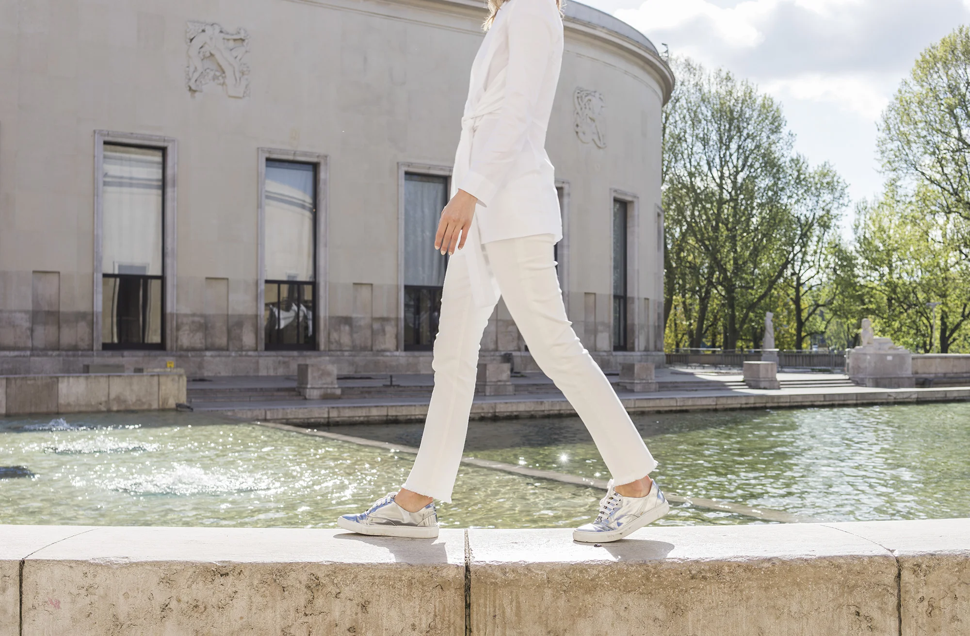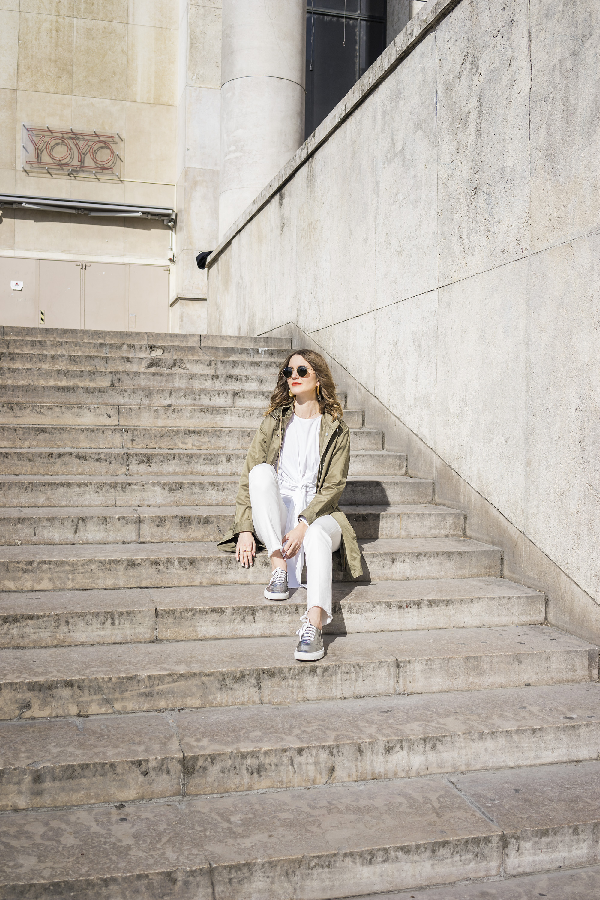 Ah heat - the sun briefly reared its head a couple of weeks ago, only to disappear behind a blanket of grey cloud more recently. These photos were shot on a fortuitously sunny day at the Palais de Tokyo (one of my favourite Paris galleries) before we had our little short-lived heatwave a couple of weekends ago (remember me wearing my off the shoulder Ganni top?). Luckily, in between passing clouds, brilliant white sun shone down onto the sand coloured stone building – making it look deceptively hot and like I'm basking in its rays. It was nippy at best (and freezing in the shadow).