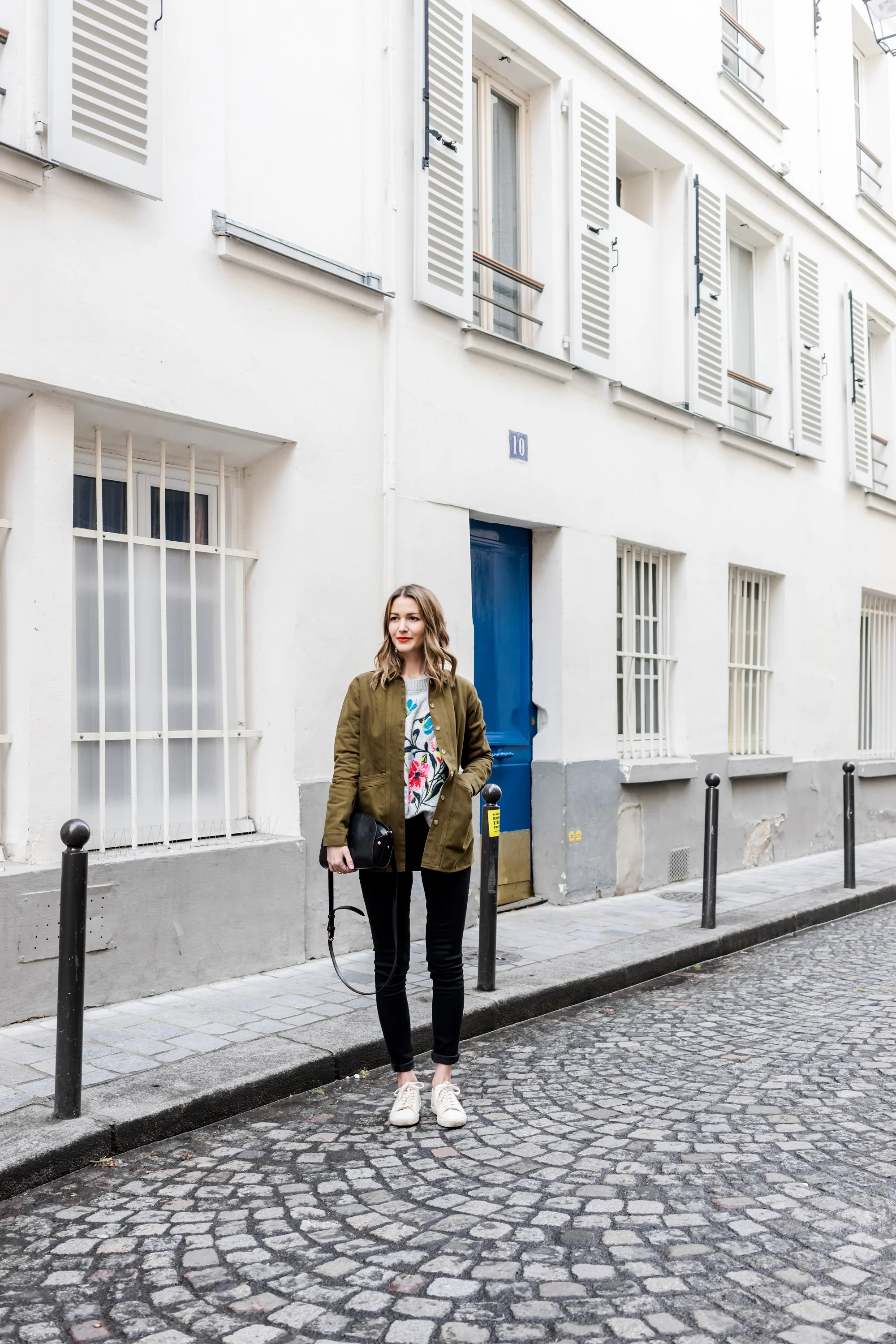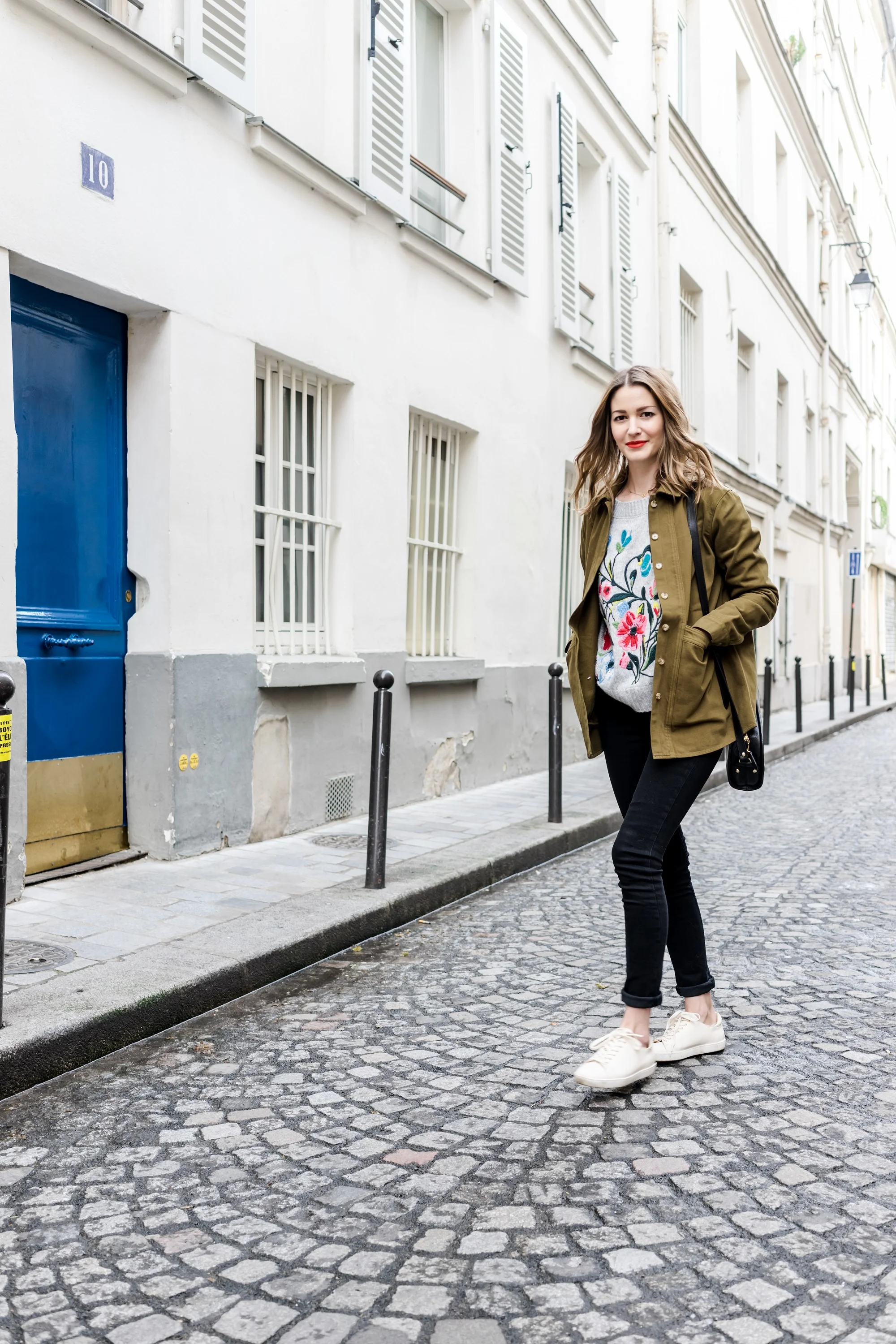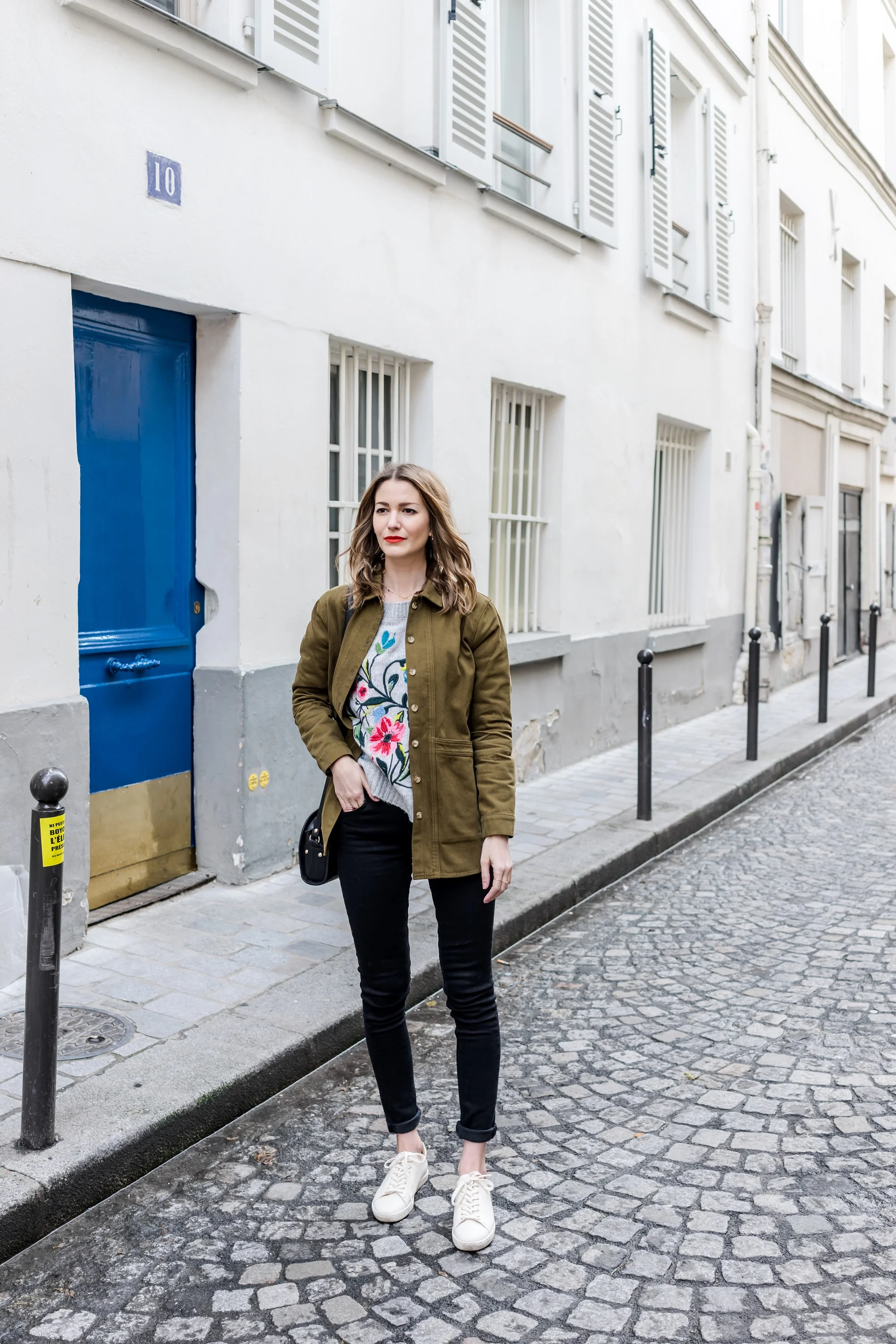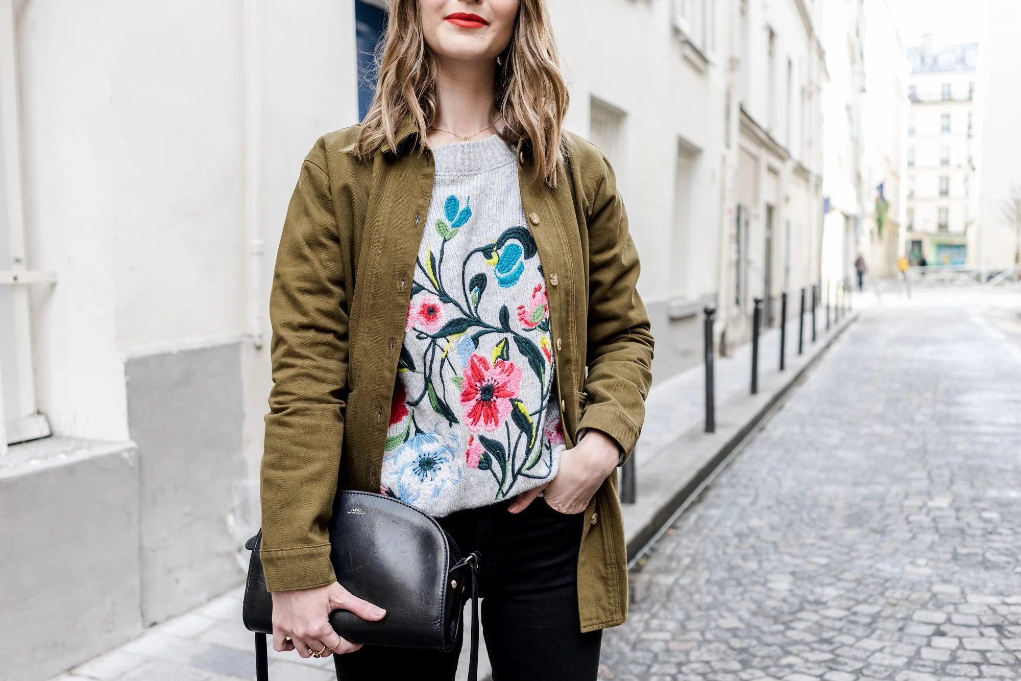 I'm wearing: Zara Sweater, similar here & here // Sezane Khaki Jacket // Sezane Sneakers, similar here // A.P.C half moon bag, similar here // Sezane Jeans // YSL lipstick