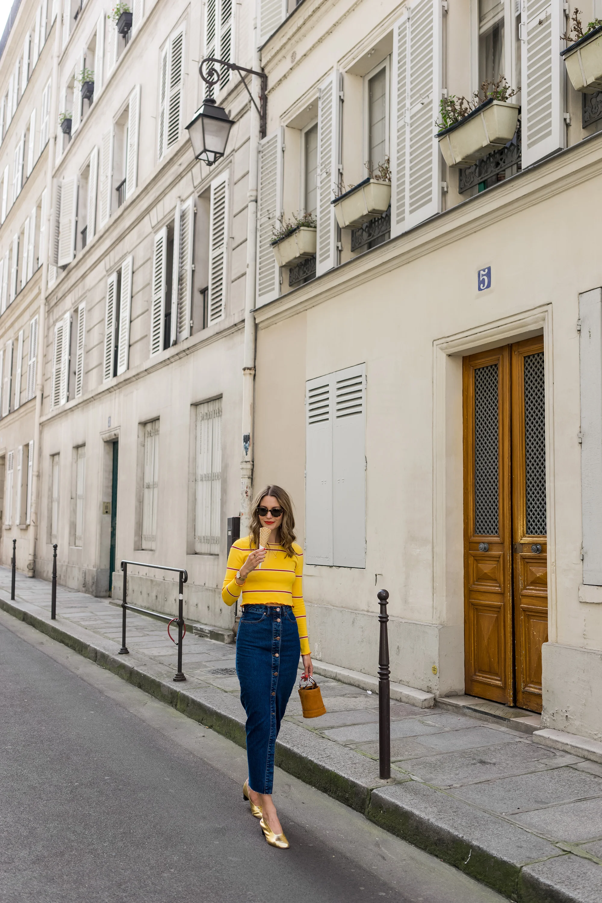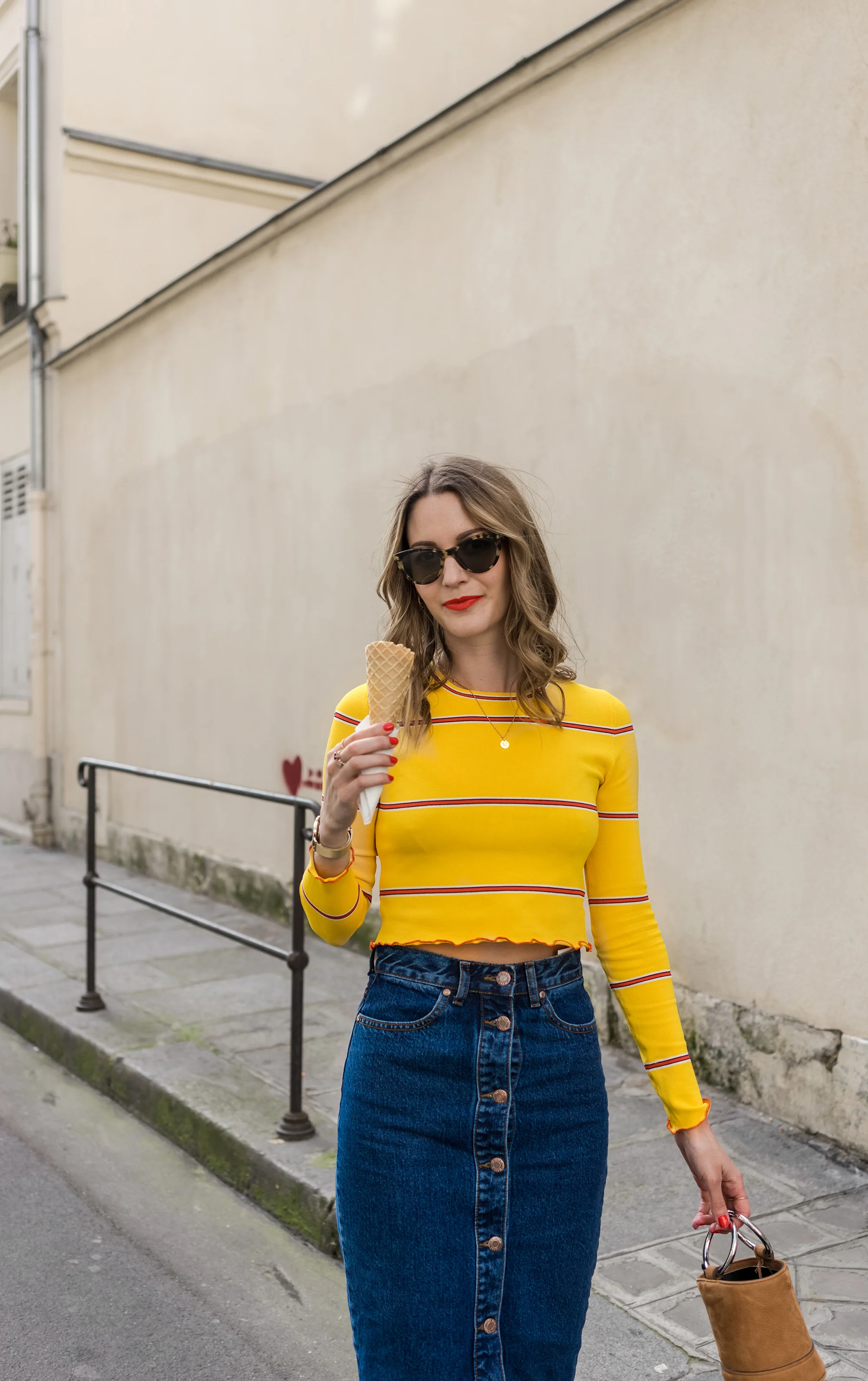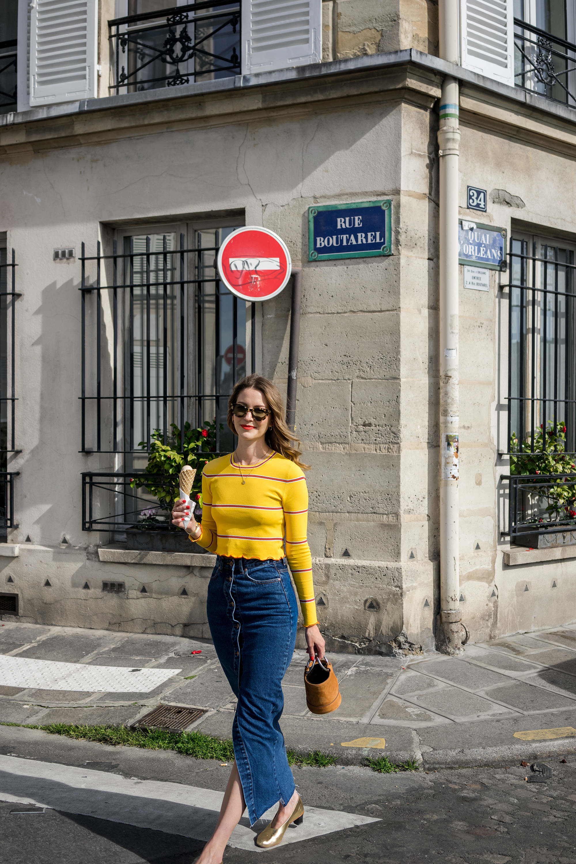 I spotted this sunshine yellow striped number and photographed it on Ile Saint Louis about three weeks ago (I'm behind on my posting), when the weather suddenly hit 23 degrees and was warm enough for ice-cream (bought from Berthillon).