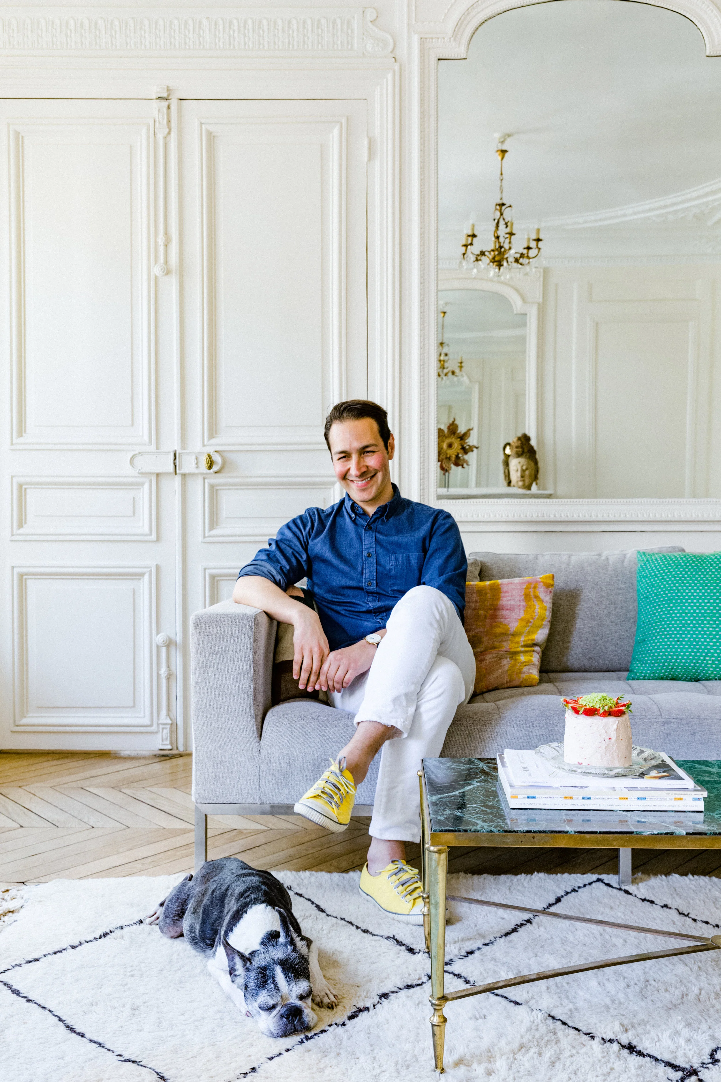 Frank is one of those people who you can't help but like. He is kind, funny, and best of all: always has cake! But before he became know as Cakeboyparis and renowned for his sugary sweet and beautifully decorated sponge cakes, he lived in San Francisco and worked at deYoung Museum after graduating with a degree in Art History from UC Berkeley. The native Californian (from San Diego) relocated to Paris six years ago with James, his partner of 15 years and their loyal Boston Terrier, Parker. Although he left the world of art behind, there are hints of his former life in the beautiful light-filled Marais apartment, which is thoughtfully decorated with unique pieces, paintings, sculptures and items picked up on their travels, such as the Berber rug from Morocco and the screen that hangs in their salon that they brought back from China. Aptly I first met Frank at a book launch hosted by La Trésorerie, a Scandi-style interiors shop in the 10ème and was instantly intrigued by this dapper chap with dog in tow and once I got whiff of his stylish apartment, I knew we were going to be friends. Last week I sat down with him (and Parker) to enjoy some freshly baked strawberry cake, while the sun streamed in through massive windows washing the whole apartment in a warm, sunny glow