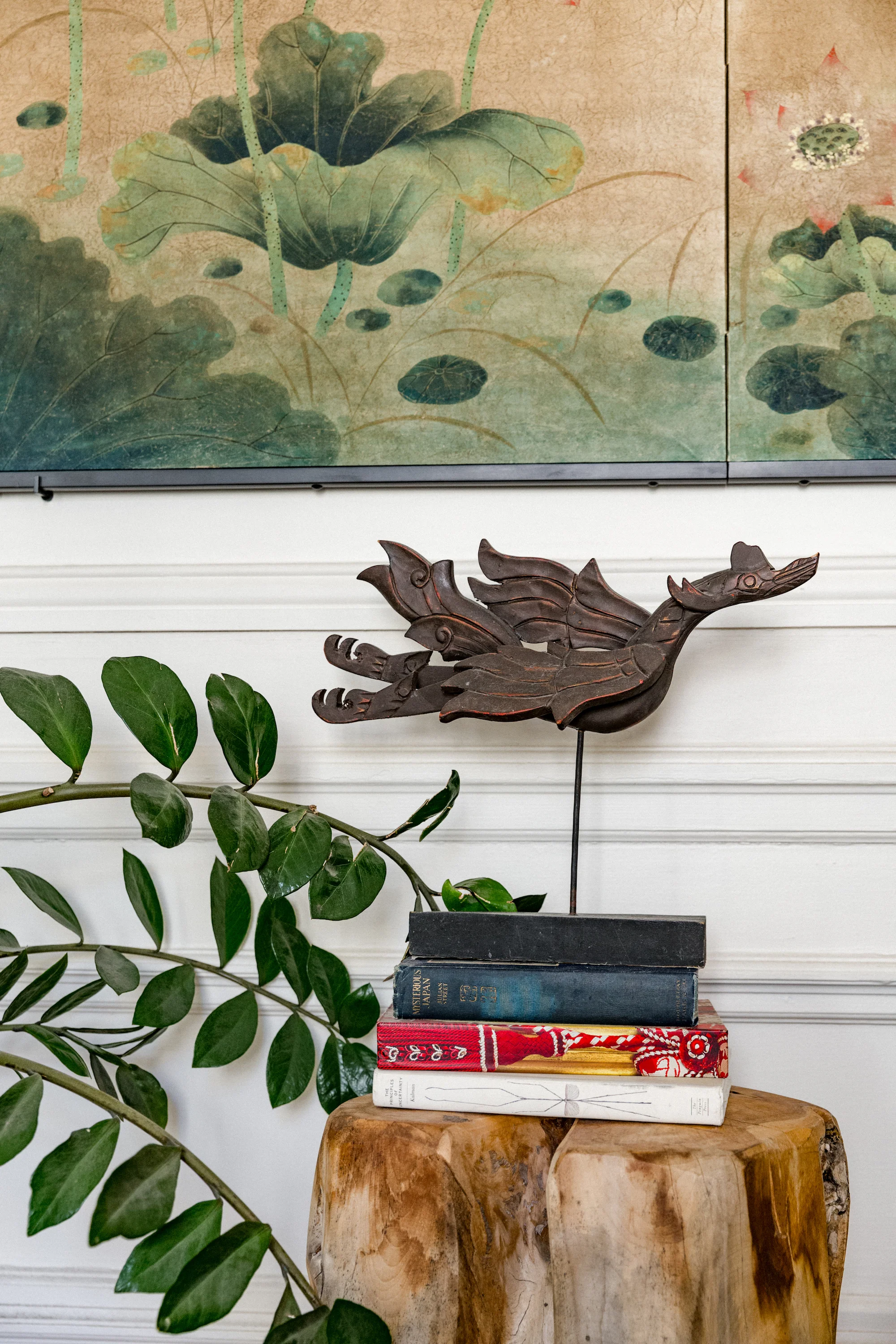I love the Chinese Lotus screen we found on a trip to Beijing. It somehow fit perfectly within a niche in our Salon.