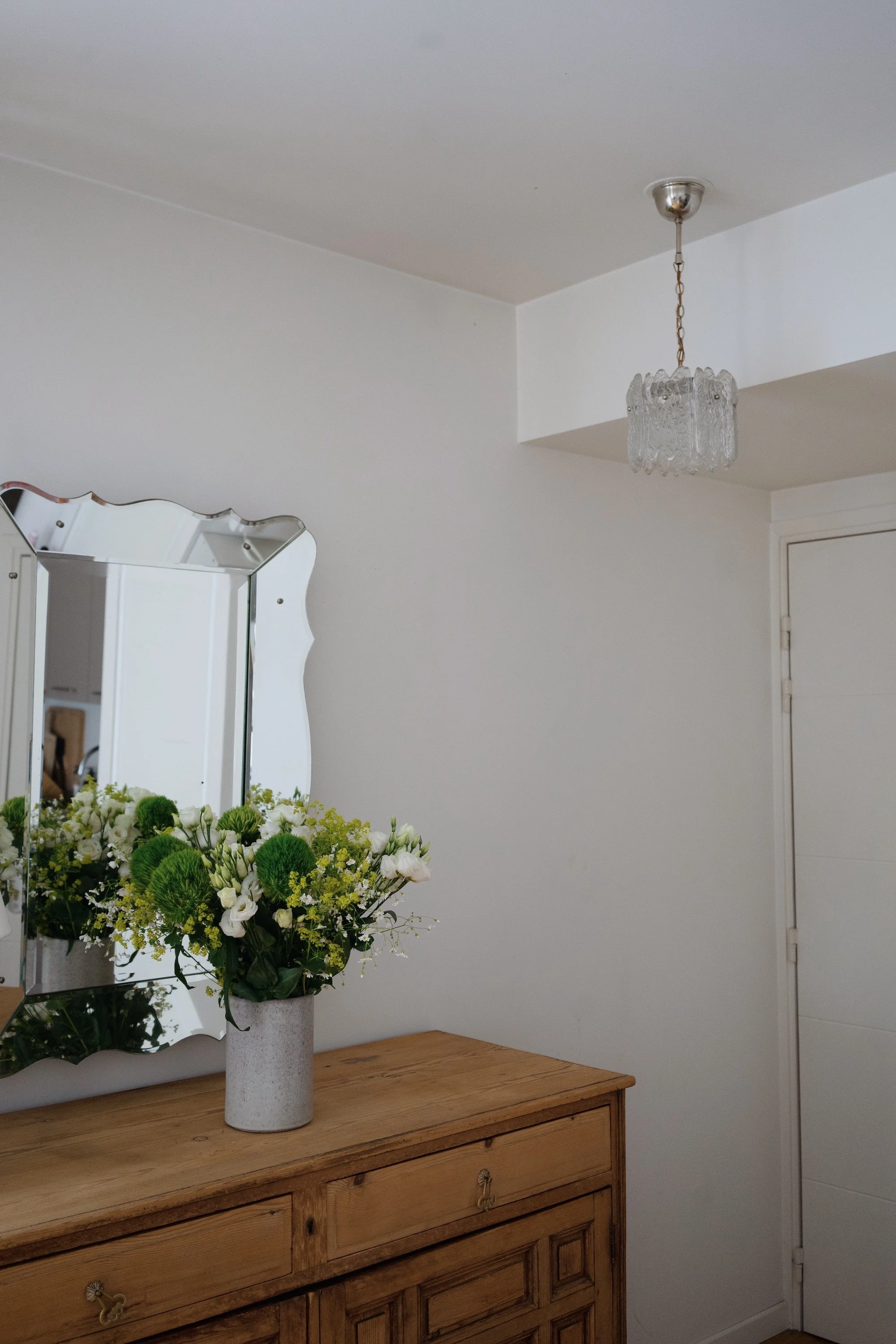 After snapping up this key piece, I also swapped out the old light (an over-sized lightbulb) for a beautiful vintage fixture by the Swedish glassware brand, Orrefors, which instantly adds charm (and gives off a nice glow) - I like to think of light fixtures as jewelry pieces for the home, and this one is just that! It elevates the corner perfectly. And finally I replaced the mirror that was there and added quite a plain (in Venetian terms) Venetian mirror with curves (also sourced on Selency) and I love how the corner has turned out. Oh and in case you’re wondering, the lamp is the Torso Table Lamp, 57 by Krøyer-Sætter-Lassen. Now all that’s left is to paint the walls! I hope you love the corner as much as I do.