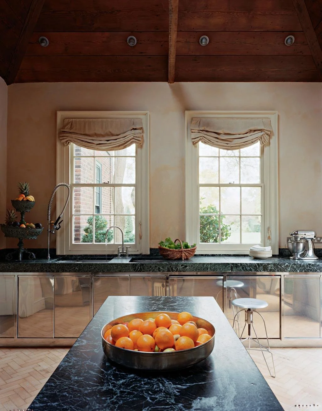 A particular favorite for me is the kitchen - I love the aluminium-fronted cupboards topped with dark green Italian marble! The intensity of the marble is beautifully contrasted by the soft Roman curtains made from the same French linen that runs throughout the house.