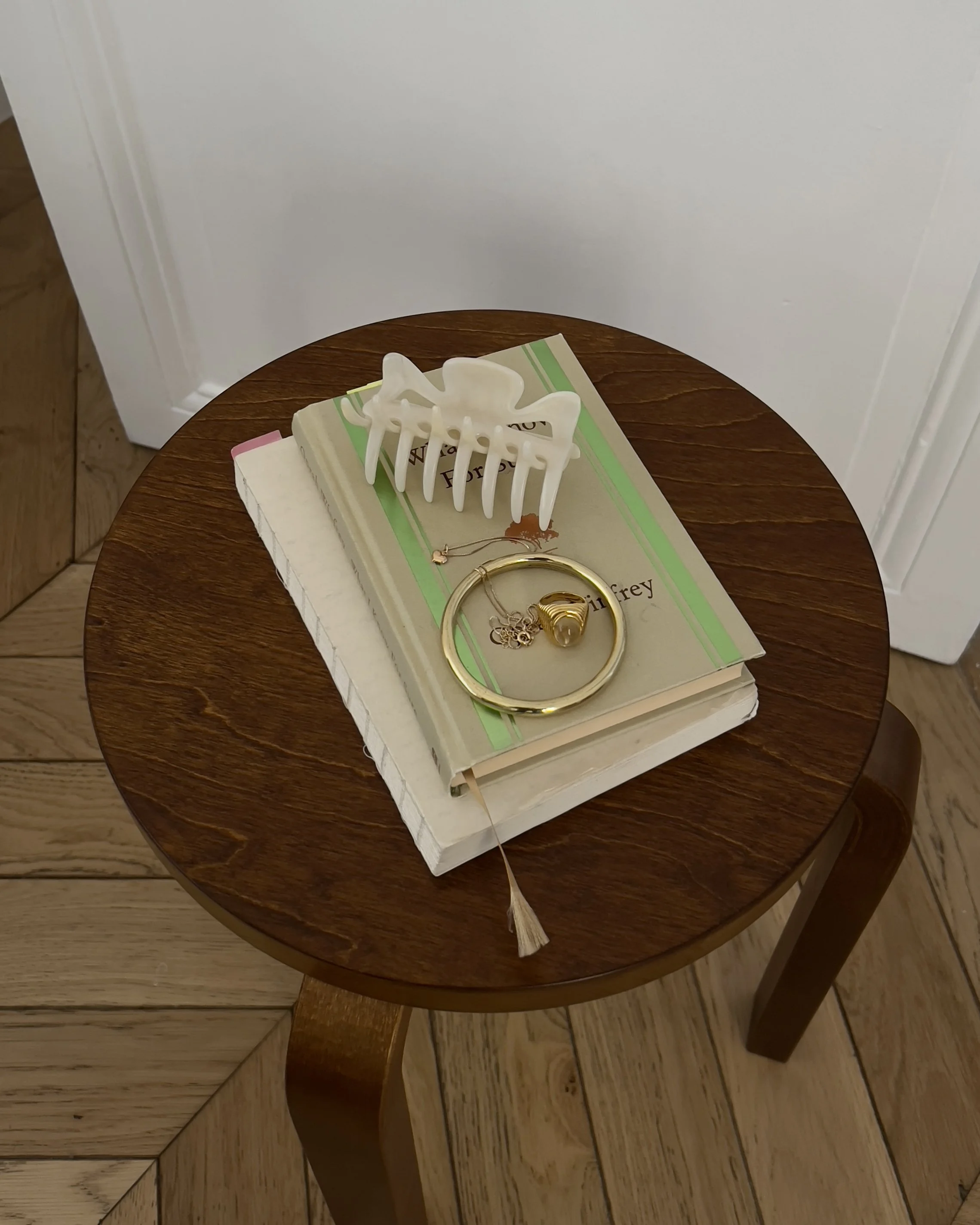 My journal, the book I’m currently reading and some accessories I take off at the end of the day.