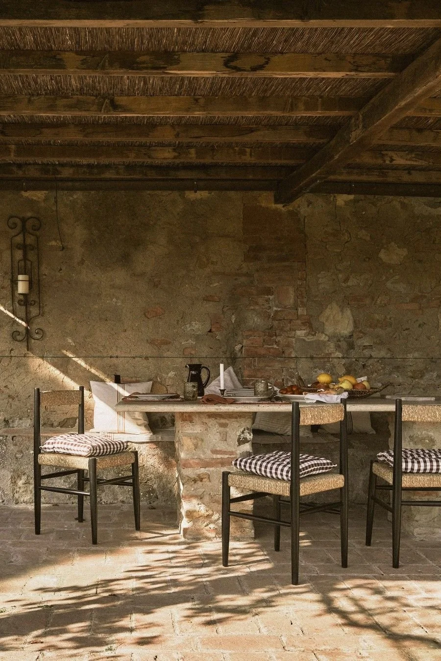 rustic wood and marble countertops. Under-counter storage is concealed with a simple, functional linen curtain. A Tuscan tile backsplash and painted serve ware on display over the wood-fired oven inject just a bit of pattern to play against the natural wood, stone and wicker found throughout the room. The result is welcoming; we can only imagine how many family dinners have been prepared here over the years.