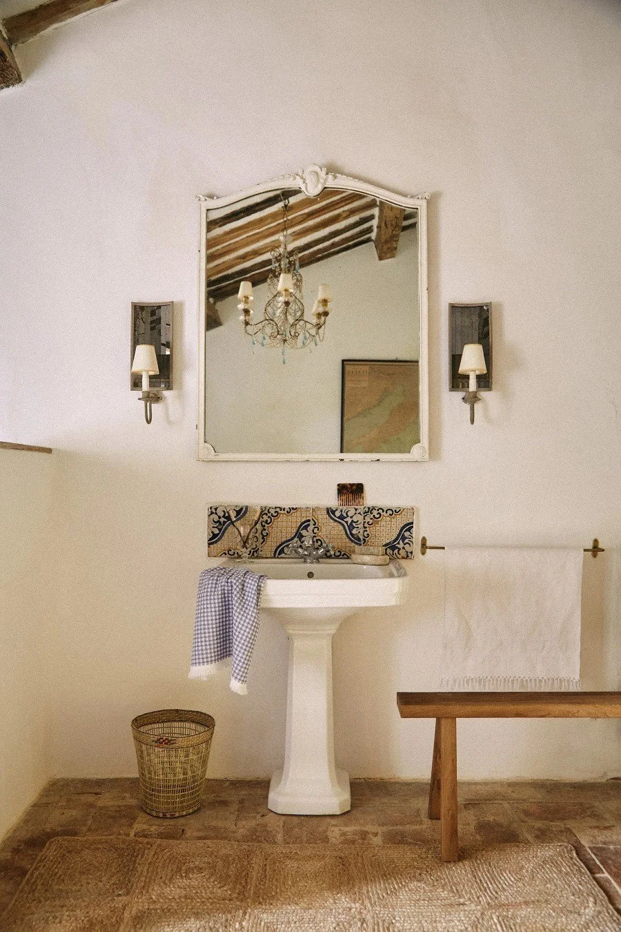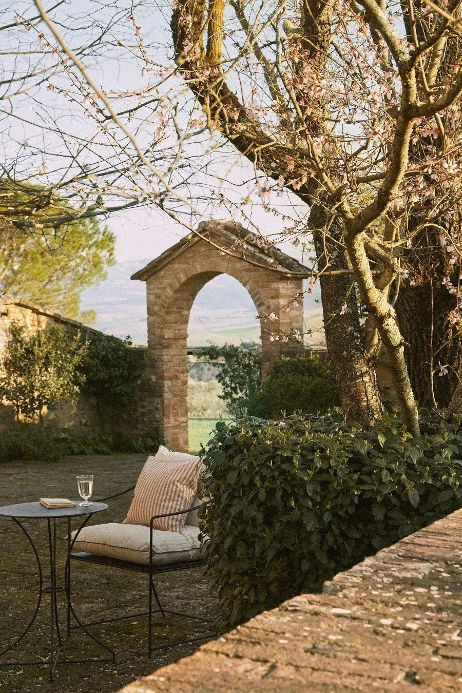 The kitchen opens to the main living area; Camilla had a wall removed to keep the ground level of the home feeling spacious. We find soft shapes throughout: a curved plaster stair rail in the main entrance, an arched bookcase in the sitting room, sloping wrought iron canopy beds designed by Camilla herself in most of the bedrooms. (She also designed the daybeds in the garden). This softness evokes the rolling hills of the surrounding landscape and fresco-style murals of cypress trees set against characteristic Tuscan hillsides by artist Virginia Loughnan, further invite the outside into one of the bedrooms. Vibrant accents of color and pattern, like the red striped curtains in a guest bedroom, a similar stripe covering the garden daybeds, or a Moroccan Boucherouite rug in the living area add playfulness to the otherwise natural space, reminds us that this is as much a lively family home as it is a countryside getaway.
